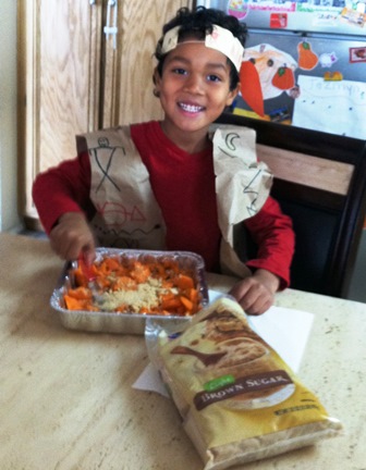 Eddie adding brown sugar to the sweet potatoes.