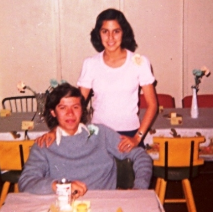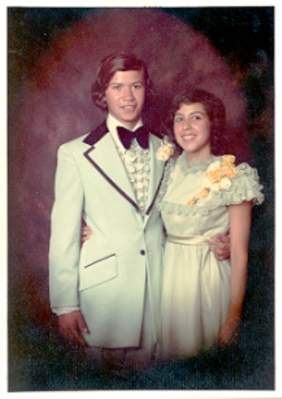 I met my husband while I was in my Sr year of high school Well I never had plans to get married until I was out of college. In fact I was even thinking of joining the service at one time. I was also thinking about going to school back east. That was all in my Jr year. Then one day my cousin Joanie invited all these guys to our church youth group. I noticed one guy in particular because of his smile. Turns out his nickname is Smiley, but his family called him Jr. Joanie liked his brother. So one Sunday when our youth group was at the skating rink, they had a girl ask boy skate. So Joanie and I each asked them to skate. Later I was talking about albums. We were talking about War and Santana. So I told him I had that album and if he wanted to come over and borrow it. Well he did and after that he started calling me. Then our youth group was having a 50's party and all of us girls had gone to the Goodwill to look for outfits. Well when they picked us up, we mentioned that we needed one more thing and that was their class ring to wear around our necks. When the night was over, he said I could keep his ring. We went to the winter dance and then the Prom. I can't remember when, but I did get a promise ring in exchange for the HS ring. Things were mmoving fast! Meanwhile I was accepted to UCI and that was fine because I was close to home. Graduation came and Jr, gave me a heart made from my birthstone. I knew I loved him already. One day in October of 73, we were playing pool at his parents house and he asked me to marry him and I said yes. I went home and told my parents and I know they were not real happy. They were so afraid I would mess up my educational plans. But I told them that Jr. supported me in them. Jr. came over and spoke with my dad. We were not going to get married for a couple of years. But when my mom and I started talking about it and she brought out a calendar, the date was set for August 10, 1974. We formally annoucned our engagement on Thanksgiving of 73 and it was in the local paper. In August of 1999, we celebrated 25 years by renewing our vows. You can read about here at 25th Anniversary page. Here is our Prom Picture.