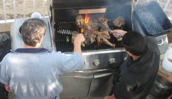 Jr and Daniel BBQing turkey for our home.