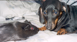 August 18, 2004, Here I am with Tinker the day my sister left to Yosemite. Tinker was sick and my sister was saying goodbye to her. I am sad to say that Tinker died a few days later. My mama was crying a lot when she died. Mama stayed with Tinker to the end. Mama and papa put her in a special box with beads, flowers and food. Brother dug a whole and we all said goodbye. Mama took picture for sister and the pictures will go on the guniea site found on the family site at Our Family 4 Him