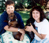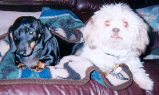 July 21, 2004. My mama let me come say hi. She feels sorry for e because she is leaving for a week and will miss me. I am sad too. I kept jumping in the car while dad and mom were cleaning it and then they out lots of things in it. I know they are leaving me. Mama says brother will take good care of me and take me for a walk everyday! See that picture up there. That is me with Tinkerbell. She is real spoiled. Especially since Lola died 2 moths ago. We were all sad, even me because Lola talked a lot and Tinker is kind of quiet. Mama says I have to go now, it is time for bed. Puppy Hugs